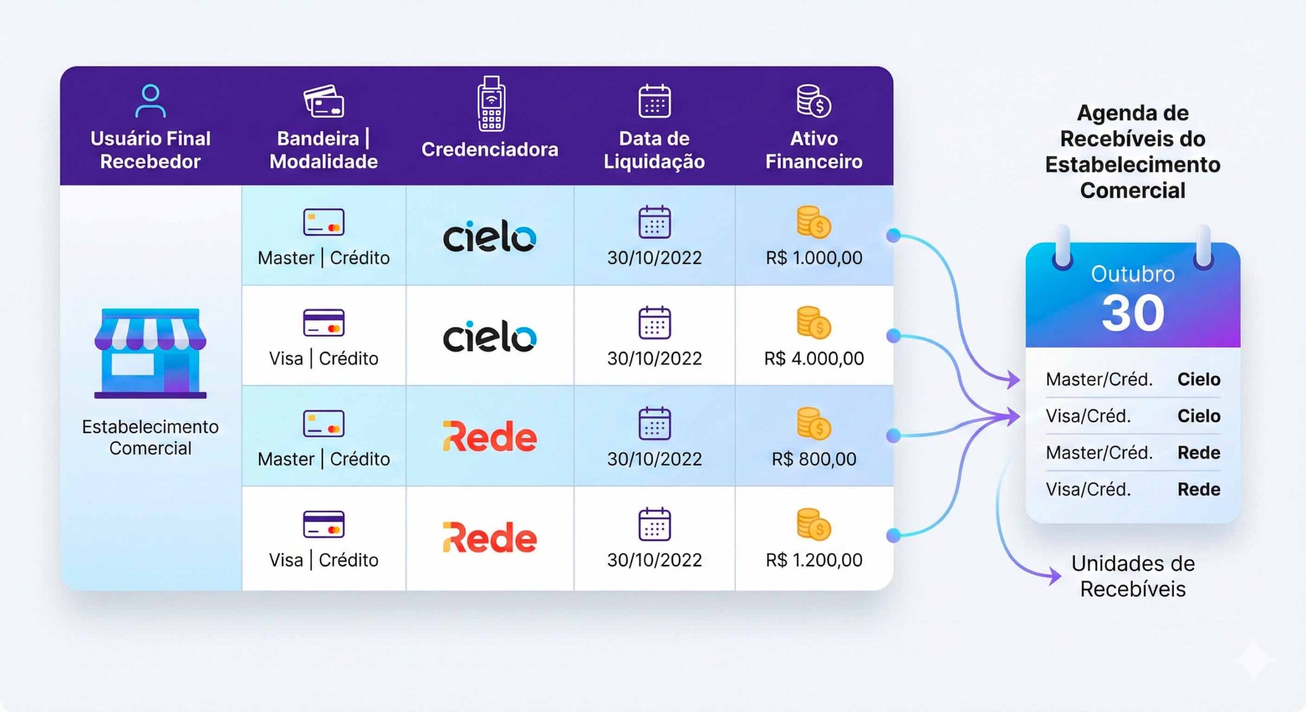Exemplo de Agenda de Recebíveis de um Estabelecimento Comercial que utiliza um POS da Cielo e outro da Rede